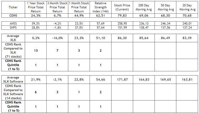 Si l’on passe à l’analyse de la dynamique des prix, les actions de Cadence ont généralement surpassé le secteur technologique au sens large et, dans une moindre mesure, l’industrie du logiciel au cours de l’année écoulée, comme le montre le tableau ci-dessous. En outre, les prix actuels de Cadence, Ansys, Synopsys et des indices de référence connexes se négocient au-dessus des moyennes mobiles sur 20, 50 et 200 jours, ce qui confirme pour l’instant une dynamique de prix plus neutre à la hausse, malgré le niveau élevé d’anxiété sur le marché global.