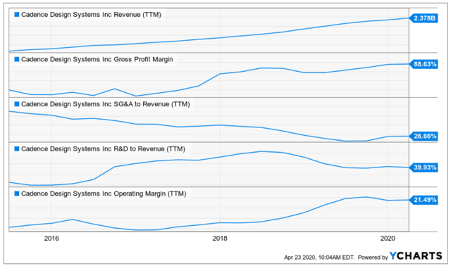 Comme on peut le voir sur le graphique ci-dessous, Cadence a réussi à augmenter la marge brute au cours des dernières années, tout en gardant sous contrôle les dépenses de S&GA et de R&D par rapport aux revenus. En conséquence, la marge d’exploitation s’est stabilisée dans la partie supérieure de la fourchette de cinq ans.