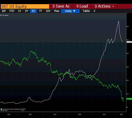 Tanger Factory Outlets (SKT) a perdu 85 % de sa valeur depuis le pic du 29 juillet 2016, il y a moins de quatre ans. Les taux d’intérêt à court terme ont atteint des niveaux à deux chiffres au deuxième trimestre 2017 et sont restés élevés, ce qui constitue un avertissement constant pour les investisseurs tournés vers l’avenir. Les intérêts à court terme en pourcentage du flottant ont atteint un sommet d’environ 69% au début de 2020 et représentent actuellement environ 49% du flottant. La ligne blanche représente les intérêts à court terme par rapport au prix de l’action (ligne verte) :