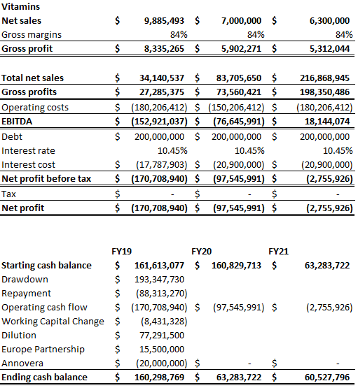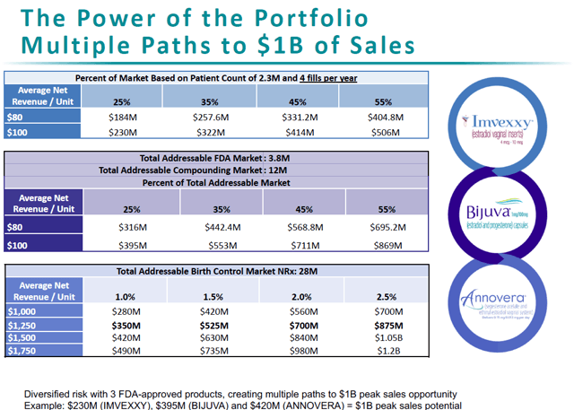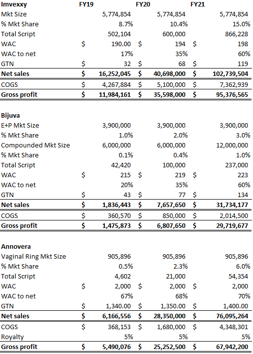 La situation sans précédent de COVID-19 a conduit la direction à suspendre les orientations de 90-110 millions de dollars et à procéder à de profondes réductions de coûts de 30 millions de dollars, dont 10 millions de dollars de frais de marketing pour Imvexxy et Annovera. La projection ci-dessus est basée sur les estimations du plancher pour 2020 fournies dans la conférence téléphonique de Cowen et inclut une projection de croissance agressive pour 2021, tout en incluant également les réductions de coûts importantes que la direction avait annoncées.