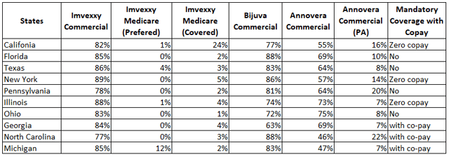 En outre, dans certains des plus grands États où le ticket modérateur est obligatoire, comme la Califonie et New York, la couverture sans restriction est restée relativement faible, inférieure à 60 %. Il s’agit probablement d’une faille que les payeurs utilisent pour restreindre la prescription d’Annovera, car les prescripteurs préfèrent éviter les formalités administratives requises pour l’autorisation préalable.