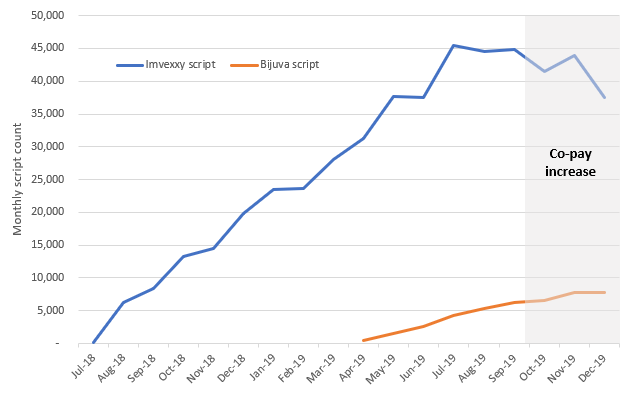 Bijuva, le prétendu produit vedette de la société, a connu un lancement décevant. Malgré le partenariat très prisé avec les pharmacies de composition et un marché de 16 millions de scripts (>2,5x plus grand que le script total d’Imvexxy), le script de Bijuva est resté terne (nettement inférieur à celui d’Imvexxy, comme le montre le graphique 1). La direction a même repoussé le lancement complet de Bijuva à 2021, après l’approbation de la version à faible dose.