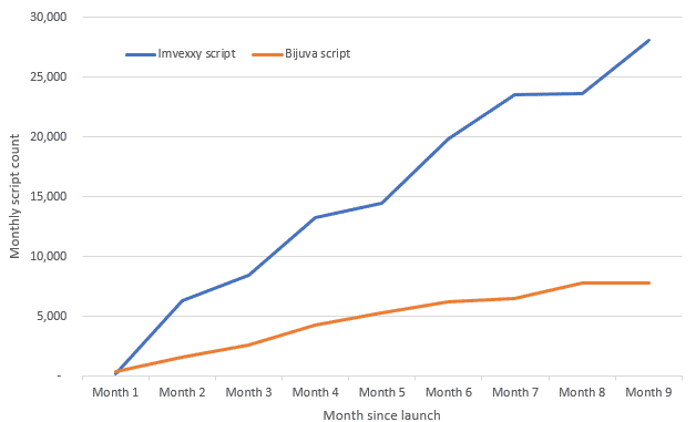Graphique 1 : Evolution des scénarios mensuels d’Imvexxy et de Bijuva depuis leur lancement