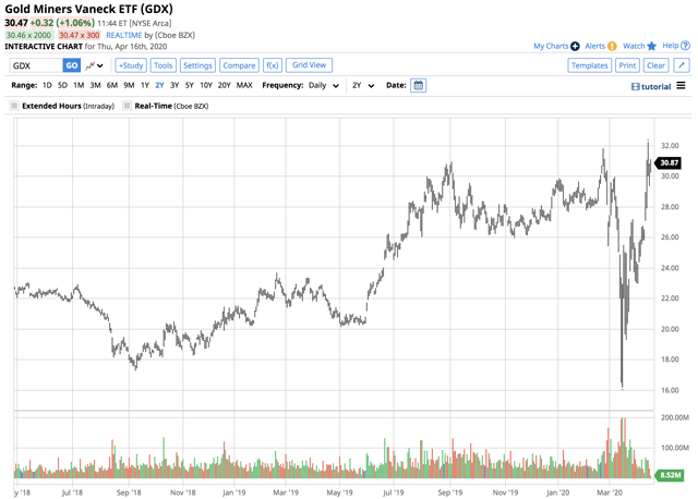 Depuis le creux de 2018, le GDX est passé de 17,28 $ en 2018 à 30,47 $ au 16 avril, soit une hausse de 76,33 %, l’ETF minier ayant surperformé le prix de l’or. Toutefois, lorsque le marché boursier a chuté en mars en raison des conditions de risque causées par la propagation du Coronavirus, le GDX est tombé à un creux de 16,18 $ par action, en dessous du plancher de 2018, tandis que le prix de l’or est resté à 289,50 $ au-dessus de son plancher de 2018.