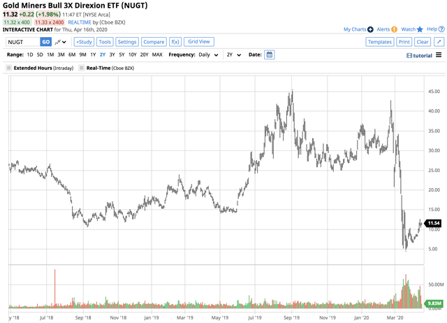 Les produits qui offrent aux acteurs du marché un effet de levier peuvent faire office d’atout sur les stéroïdes lorsqu’il s’agit de pourcentage de performance. Toutefois, lorsque le prix évolue dans le mauvais sens, les outils peuvent devenir les collecteurs de poussière d’un portefeuille. L’indice Direxion Daily Gold Miners Index Bull 2X Shares (NUGT) offre une performance quotidienne deux fois supérieure à celle du produit VanEck Vectors Gold Miners ETF (GDX). De nombreux acteurs du marché utilisent le NUGT ces jours-ci, car le marché haussier de l’or continue de faire grimper le prix du métal jaune.