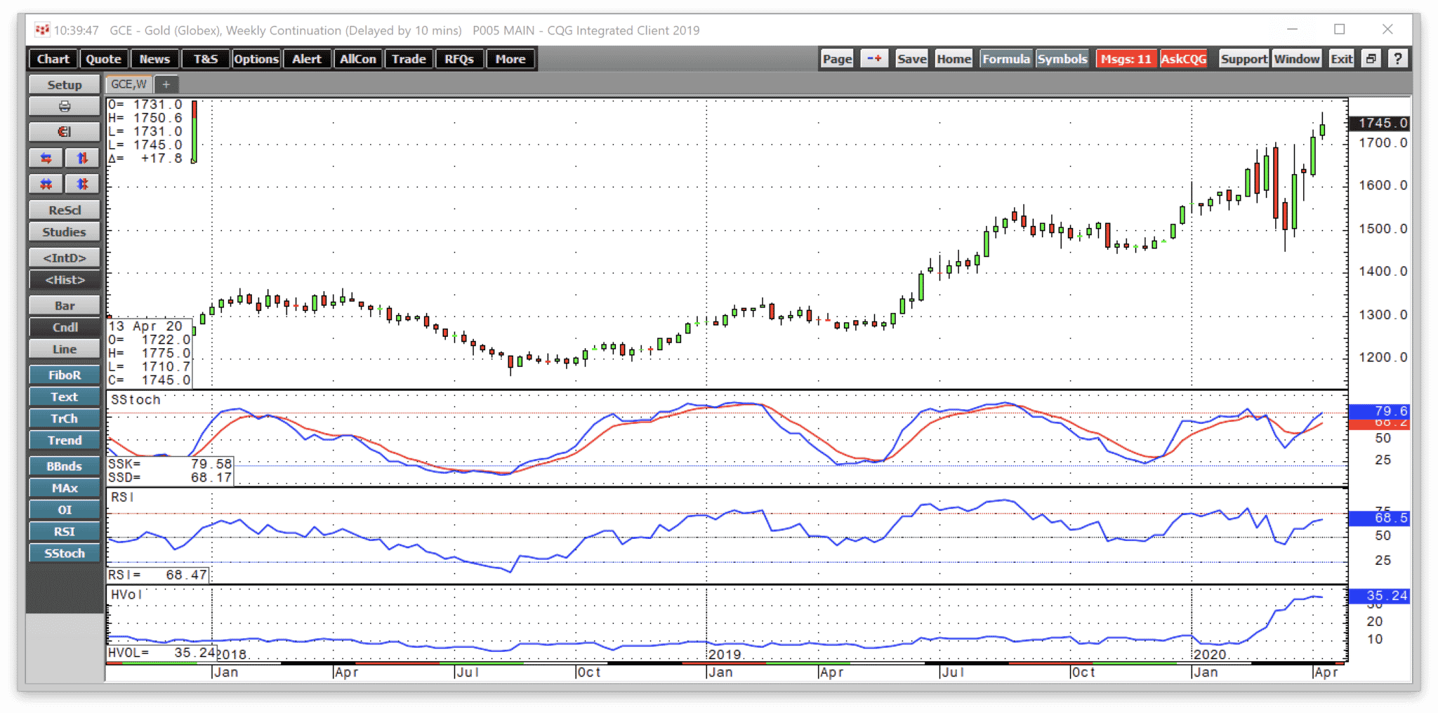Le graphique hebdomadaire souligne l’ascension du métal précieux qui a atteint son dernier sommet à 1775 $ sur le contrat à terme en continu le 14 avril. Le contrat actif du mois de juin a atteint un sommet de 1 788,80 $ et se négociait au niveau de 1 750 $ l’once le 16 avril.