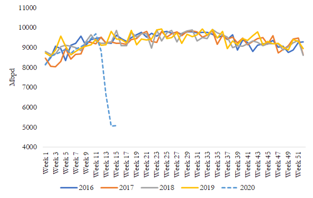 La demande américaine d’essence semble se stabiliser selon les données publiées la semaine dernière par l’Administration américaine de l’information sur l’énergie [EIA]. La demande avait chuté précipitamment en mars, avec la mise en place d’ordonnances de « séjour à domicile » dans la plupart des régions du pays, dans le cadre de mesures de distanciation sociale liées au coronavirus. Au cours de la première semaine d’avril, elle était de 5,1 MMbpj, soit 47 % de moins que le volume de la demande de la même période en 2019 (voir figure). Cependant, selon les dernières données, la demande d’essence a rebondi de 17 Mbpj au cours de la dernière semaine par rapport à la semaine précédente et n’est plus « que » 43 % inférieure à celle de la même période de 2019.