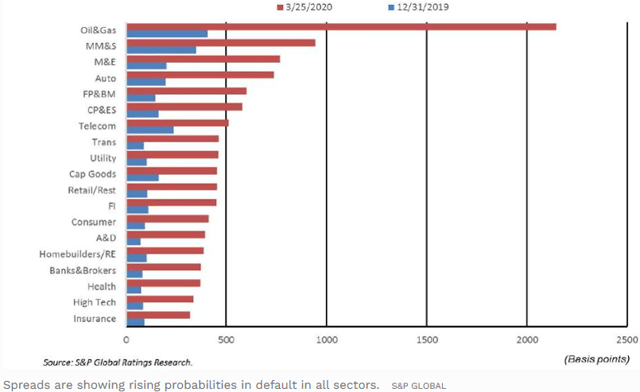 La crise actuelle a, comme on pouvait s’y attendre, entraîné une augmentation significative des primes de risque dans de nombreux secteurs du marché. Les colonnes représentent l’écart, ou la différence, entre les taux demandés aux prêteurs par les différents types de sociétés. Ce graphique a été créé le 25 mars, soit une semaine seulement après que le S&P 500 ait atteint son plus bas niveau cyclique actuel. Les colonnes rouges ont généralement reculé de 10 à 50 % vers le bleu, mais vous pouvez voir que le pétrole et le gaz, l’automobile et d’autres secteurs cycliques ont été les plus touchés.