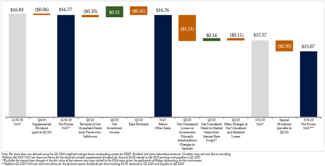 Examinons à nouveau ce que les équipes de direction de la BDC appellent le « pont NAV » illustré ci-dessus. La VNI du T1 est essentiellement stable par rapport au T4 2019 avant A) (1,21 $) perte non réalisée principalement attribuable aux variations du delta entre certains taux d’intérêt, B) la compensation approximative des gains de marché à marché sur les couvertures par rapport aux « autres variations des pertes nettes réalisées et non réalisées », et C) un dividende spécial anticipé de 0,50 $ par action. Étant donné que la génération de revenus du portefeuille et la santé globale de la société de portefeuille restent intactes, ces pertes non réalisées diminueront au fil du temps pour atteindre zéro. Si TSLX vendait effectivement des prêts à perte ou devait déprécier des sociétés de portefeuille pour cause de non-paiement, ce serait une autre histoire. C’est une histoire dont nous allons entendre parler par d’autres BDC avant la fin de la saison des bénéfices du premier trimestre.