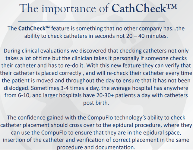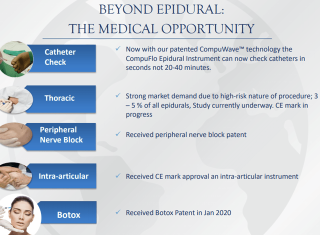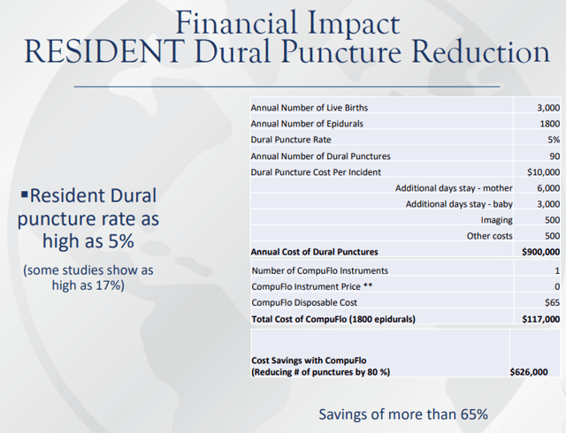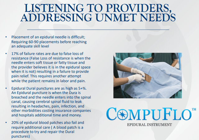 la société concentre ses efforts sur le développement du CompuFlo pour les injections épidurales, le type d’injections dans la moelle épinière qui bloque la douleur lors de l’accouchement. Ces injections sont complexes et risquées, nécessitant un entraînement important, jusqu’à 40-60 tentatives.