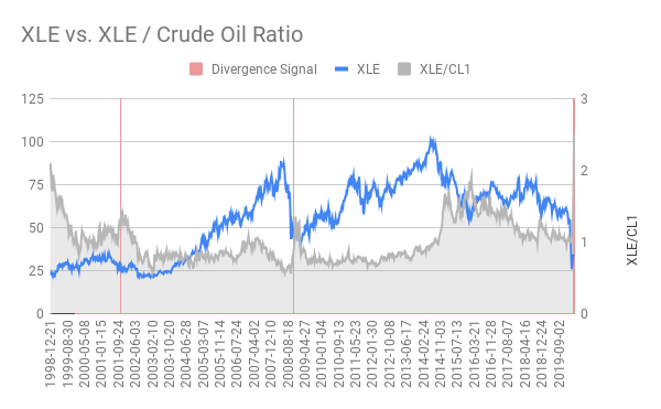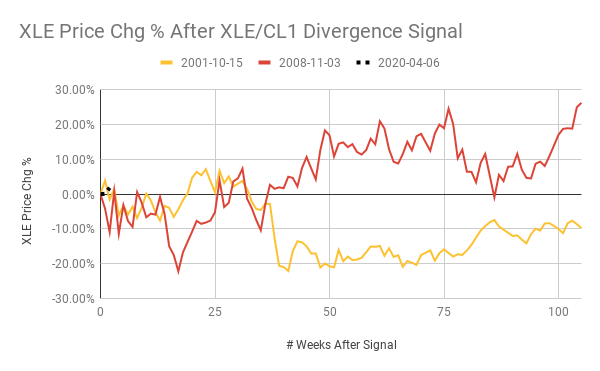 Sans surprise, les deux cas ont été les turbulences du marché de la Grande Récession de 2001 après le 11 septembre et de 2008, au cours desquelles XLE a également rebondi à partir des creux tout en divergeant positivement du pétrole brut. Cependant, la reprise s’est essoufflée dans les deux cas, et la baisse s’est accentuée au cours des trois mois suivants :