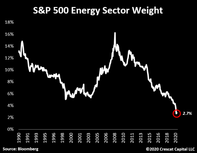 La destruction sans précédent des prix a fait que le poids du secteur de l’énergie dans le S&P 500 (SPY) est tombé sous la barre des 3 %.