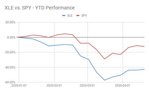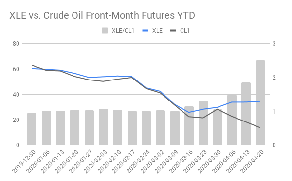 Une évolution apparemment positive est que XLE a pu poursuivre son furieux rebondissement à partir des bas, malgré le carnage des prix du pétrole brut en dessous de zéro. En effet, XLE s’est complètement éloigné du pétrole brut depuis la fin du mois de mars :