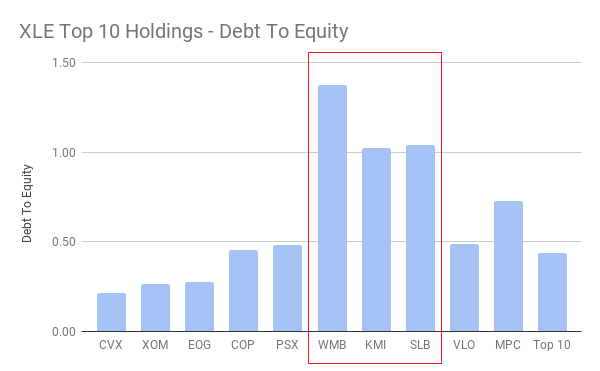 Sans aucun doute, les fondamentaux à court terme sont plus que sombres pour le pétrole brut, le stockage conventionnel devant être épuisé d’ici le mois prochain. Cela étant dit, nous pensons que les grandes entreprises énergétiques à forte capitalisation, dotées de bilans solides, seront très probablement en mesure de surmonter la tempête jusqu’à ce que l’offre et la demande s’équilibrent. Dans le cas de XLE, 6 des 10 plus grandes entreprises, y compris les 5 plus grandes, qui représentent près de 60 % de l’allocation de XLE, ont des ratios d’endettement solides, bien inférieurs à 1 :