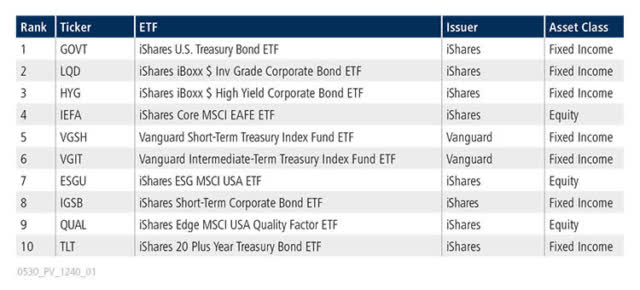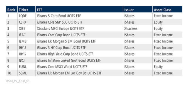Il y avait sept produits à revenu fixe parmi les ETF européens les plus négociés en avril, l’ETF iShares $ Corporate Bond UCITS se classant en première position. C’est la troisième apparition consécutive du fonds dans la liste des dix premiers cette année.