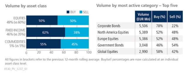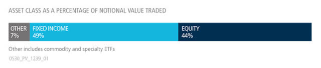 En pourcentage de la valeur notionnelle totale, les actions représentaient 44 % et les titres à revenu fixe 49 %, le reste étant constitué d’ETF de matières premières et de spécialités. La proportion de transactions d’ETF américains exécutées sur la plateforme via l’outil Tradeweb AiEX était de 36 %.