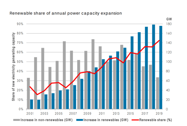 Les chiffres de l’IRENA (Agence internationale pour les énergies renouvelables) montrent qu’un tiers de la nouvelle production d’électricité en 2019 dans le monde était destiné aux énergies renouvelables. C’est ce qu’illustre la figure ci-dessous :