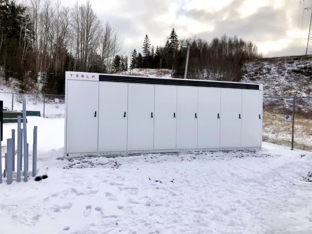 * Saint John Canada : dans le cadre d’un intéressant projet pilote de 1ère phase, Tesla fournit un système Megapack de 1,25MW/2,5MWh à Saint John. Voici une photo de ce projet :