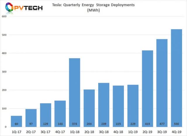 Les installations solaires ont connu une croissance en 2019, mais n’ont réussi à atteindre qu’un décevant 173MW pour l’année. On a parlé avec optimisme de l’activité des systèmes de toiture en verre solaire pour 2020. Une grande partie de cette activité pourrait être centrée en Californie. La poursuite de la croissance pourrait dépendre de la rapidité avec laquelle l’État pourra se remettre de la crise COVID-19. Toute croissance des installations solaires ferait augmenter le nombre de produits résidentiels Powerwall. Cependant, cela suppose que Tesla ait le produit à fournir.