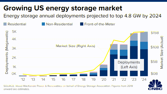 Comme je l’ai détaillé ici, la croissance du stockage d’énergie des batteries est une conséquence inévitable de la croissance des énergies renouvelables. L’illustration ci-dessous, produite par Wood Mackenzie, montre la projection de croissance pour les États-Unis :